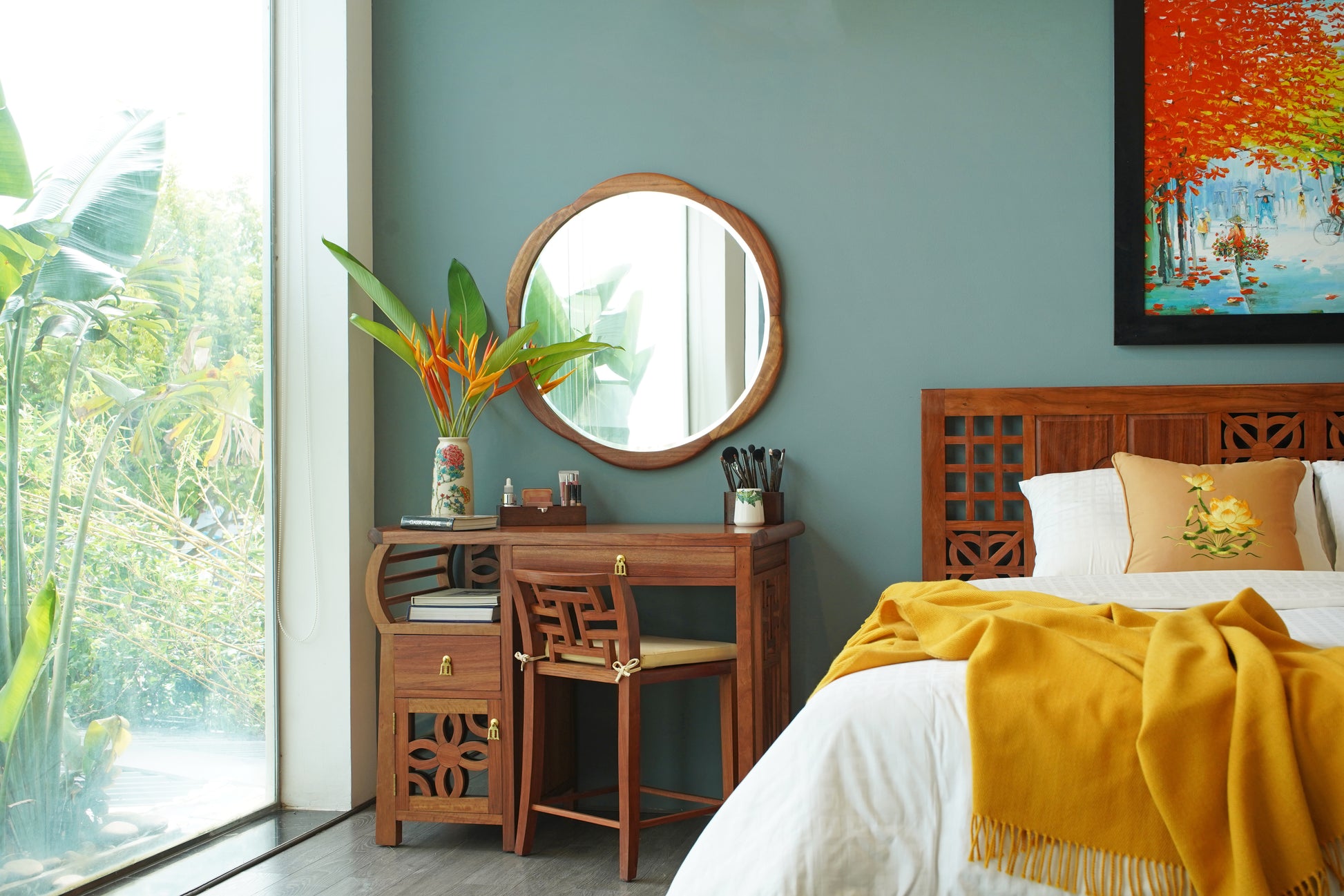 Bàn phấn và gương - cặp đôi hoàn hảo cho mọi phòng ngủ. Nơi trang điểm, làm đẹp, đồng thời là nơi đọc sách, nhâm nhi chén cà phê vào buổi sáng, chén trà vào buổi tối trước khi đi ngủ.
