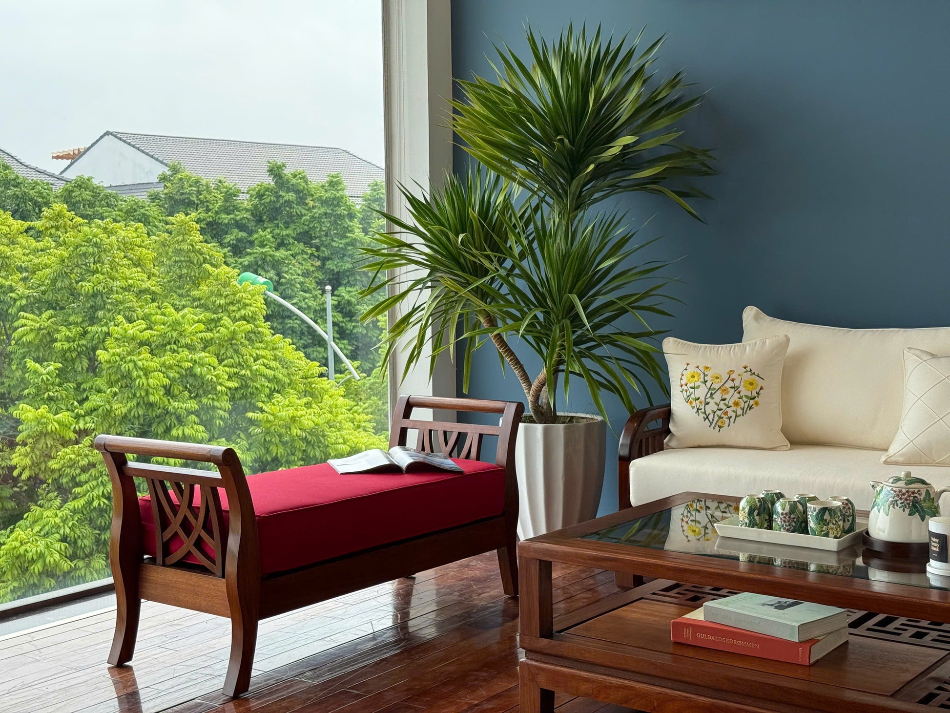 Bench có thể đặt song song với sofa như một chỗ ngồi mở rộng, hoặc bố trí lệch góc để gợi nhịp điệu thị giác, giúp phòng khách không chỉ tiện nghi mà còn trở thành một bức tranh thẩm mỹ sống động.