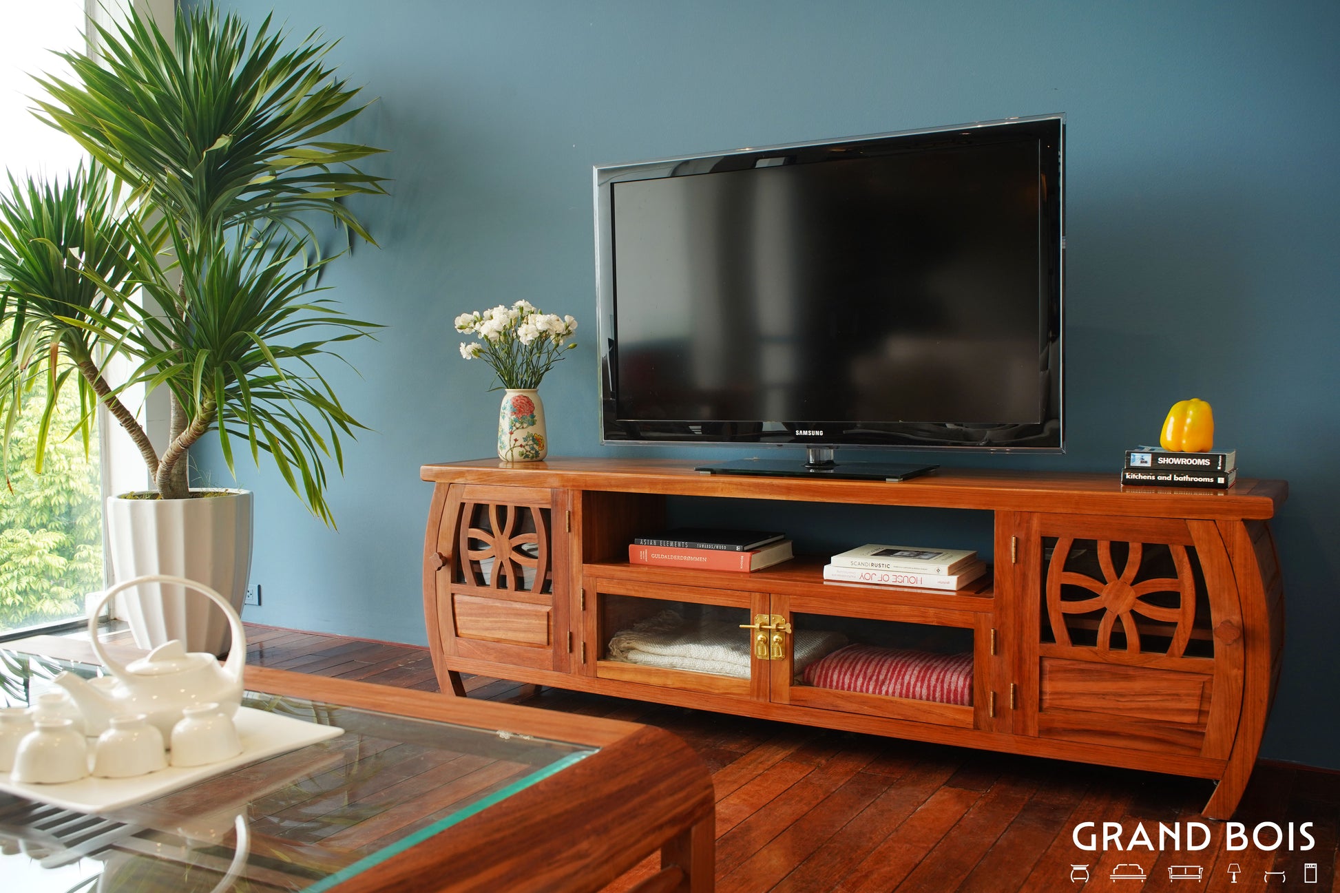 Họa tiết hoa cúc mềm mại hòa cùng đường cong tinh tế, biến chiếc kệ tivi tưởng chừng đơn giản thành tâm điểm nghệ thuật của phòng khách.